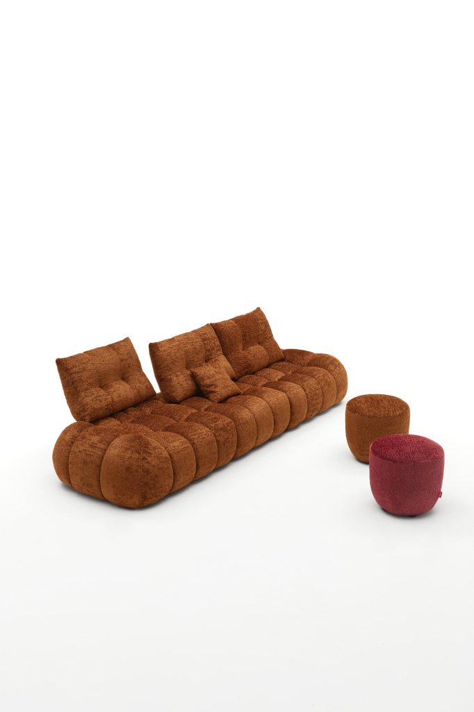 Ogni dettaglio di T-Moon racconta la ricerca progettuale di Aerre Italia, un marchio che ha fatto del comfort sartoriale e della qualità dei materiali il proprio tratto distintivo. Il design “a bolle” dell’imbottitura dona movimento e leggerezza visiva, trasformando il divano in un oggetto scultoreo capace di impreziosire qualsiasi spazio con discreta eleganza.