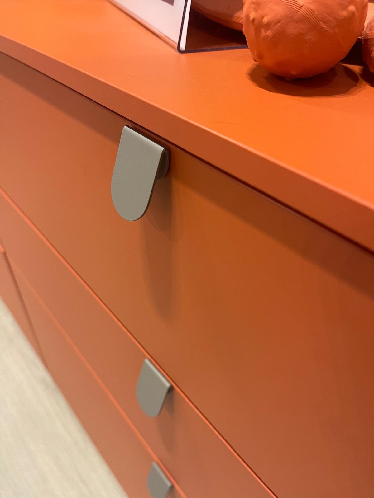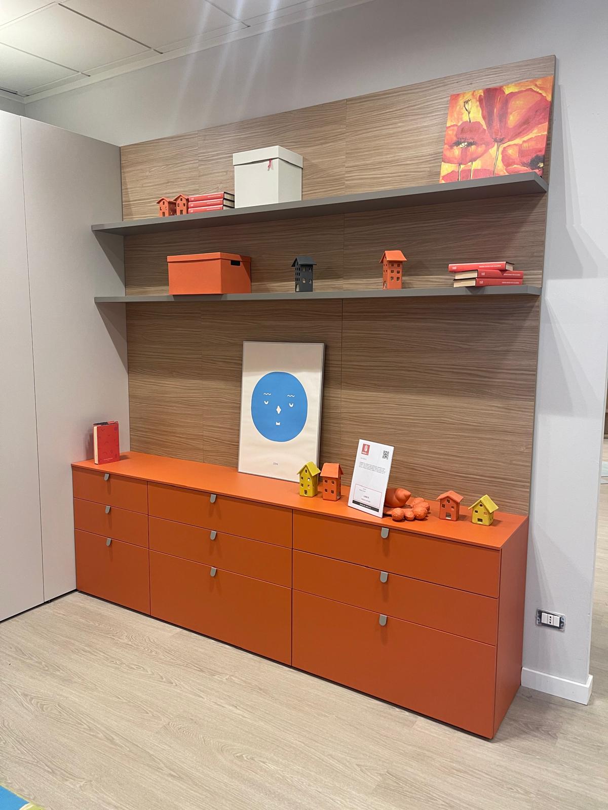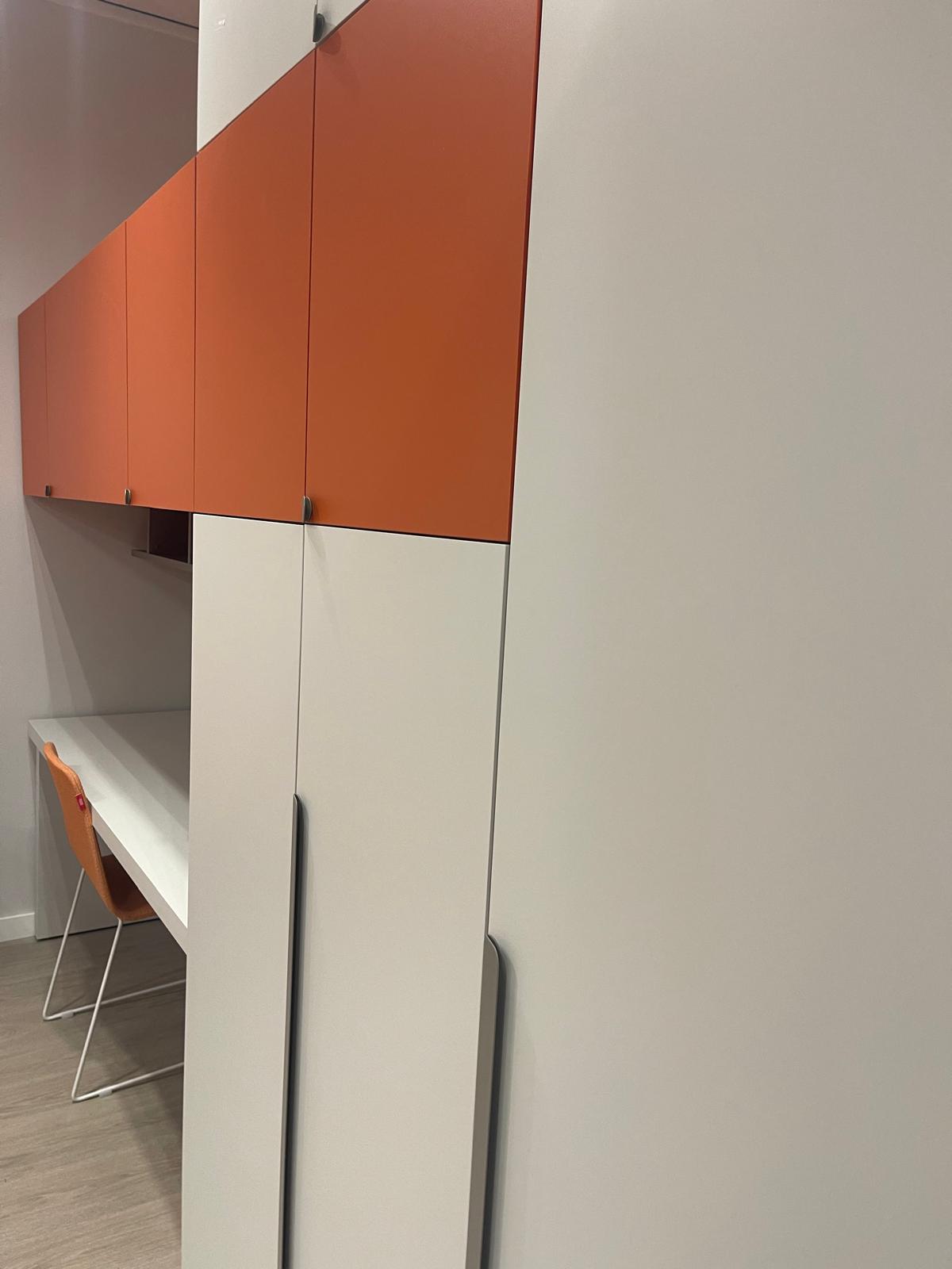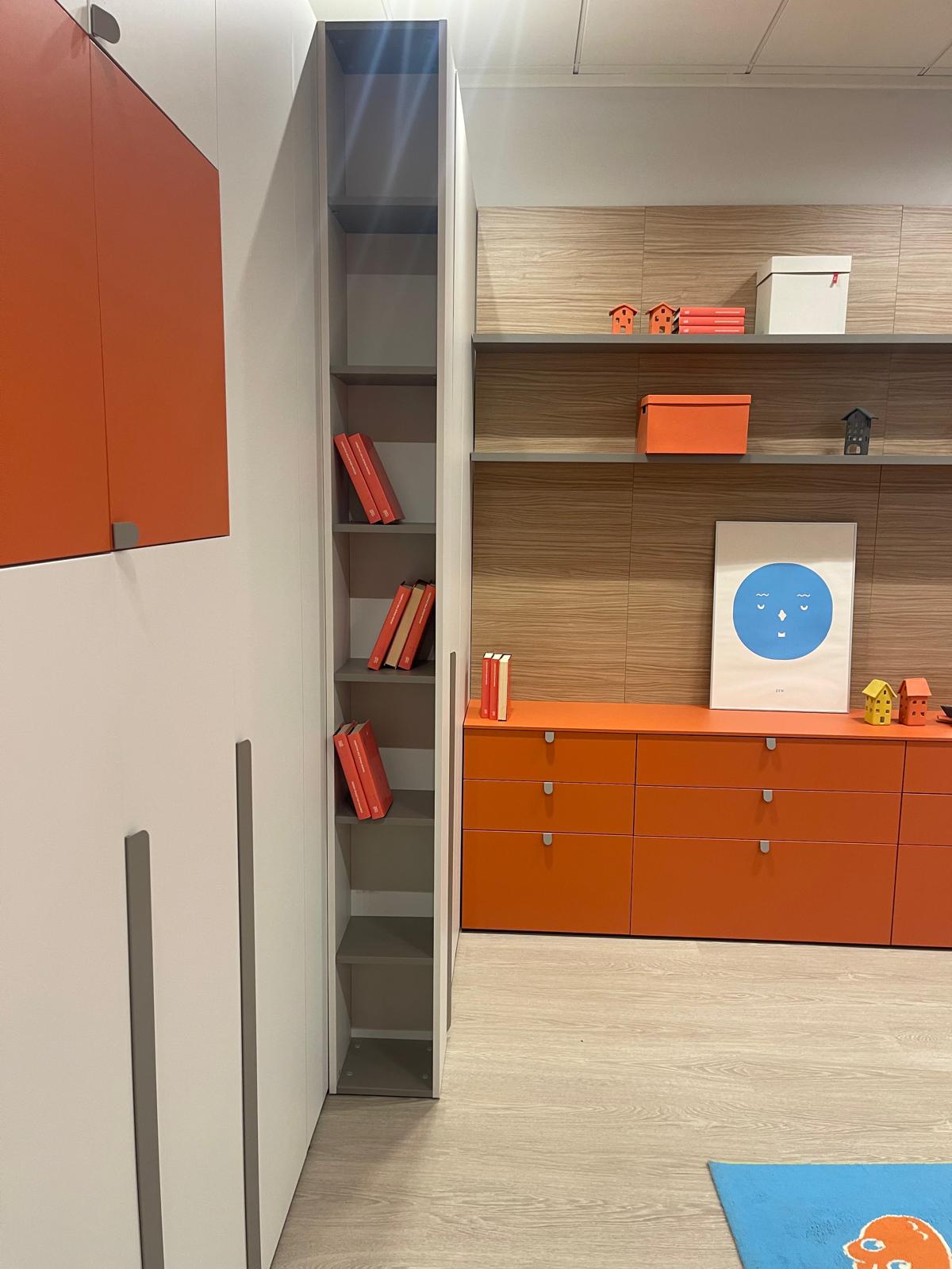 Dal punto di vista estetico, la cameretta è proposta in una combinazione di finiture Nuvola, Papaya, Nocciolo e Basalto, una palette contemporanea che unisce tonalità neutre e accenti più vivaci, creando un ambiente dinamico e piacevole da vivere ogni giorno.