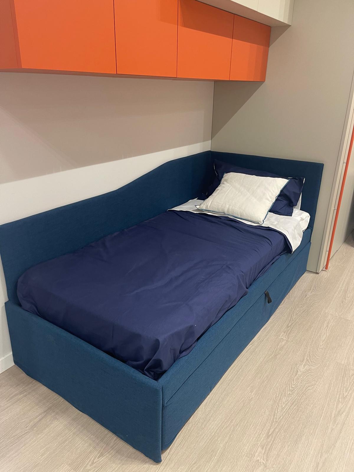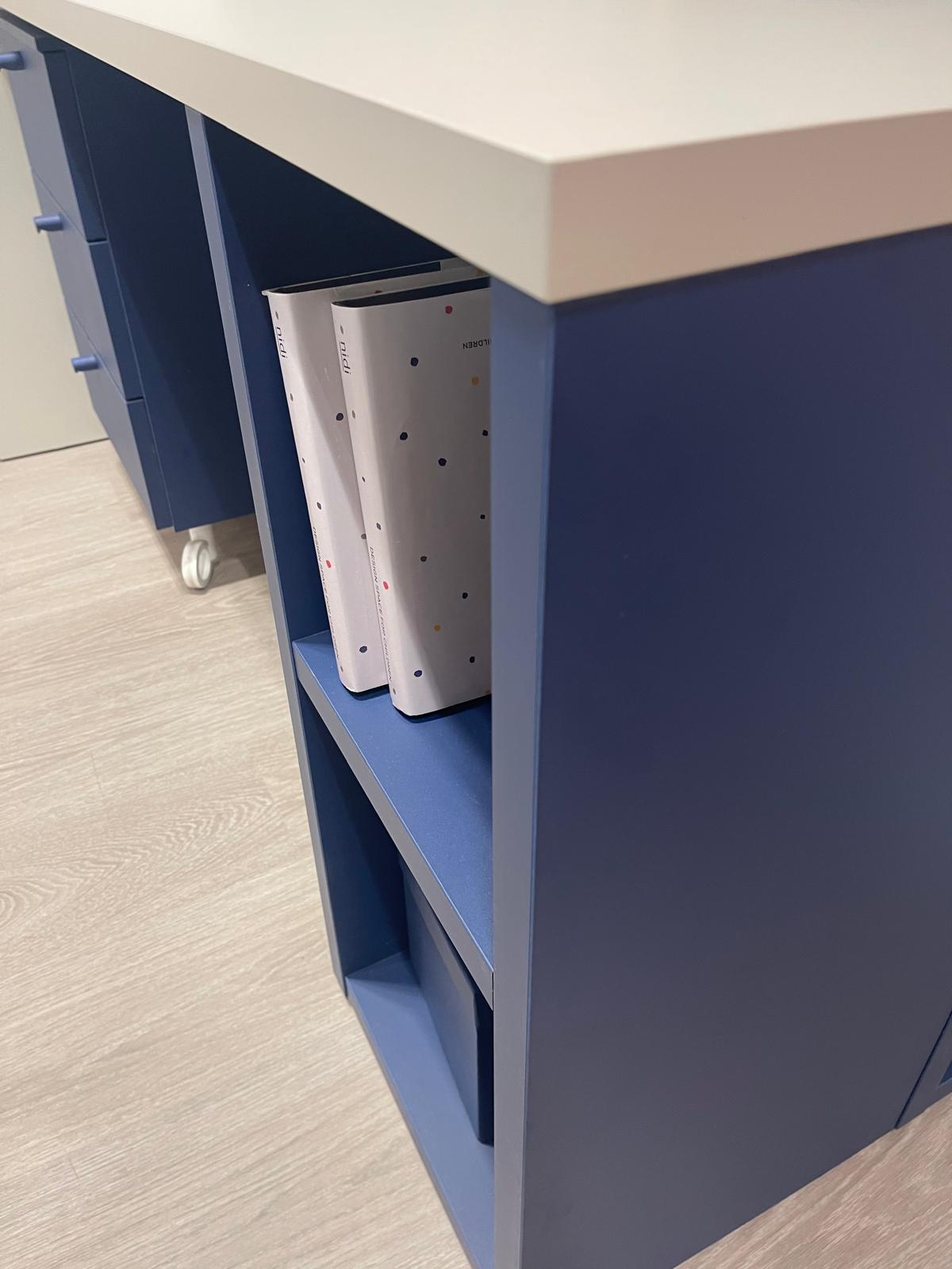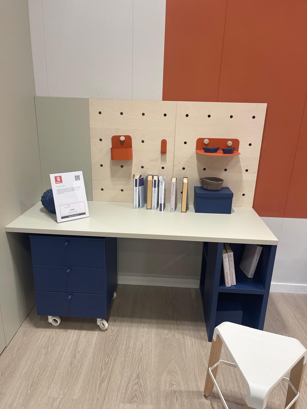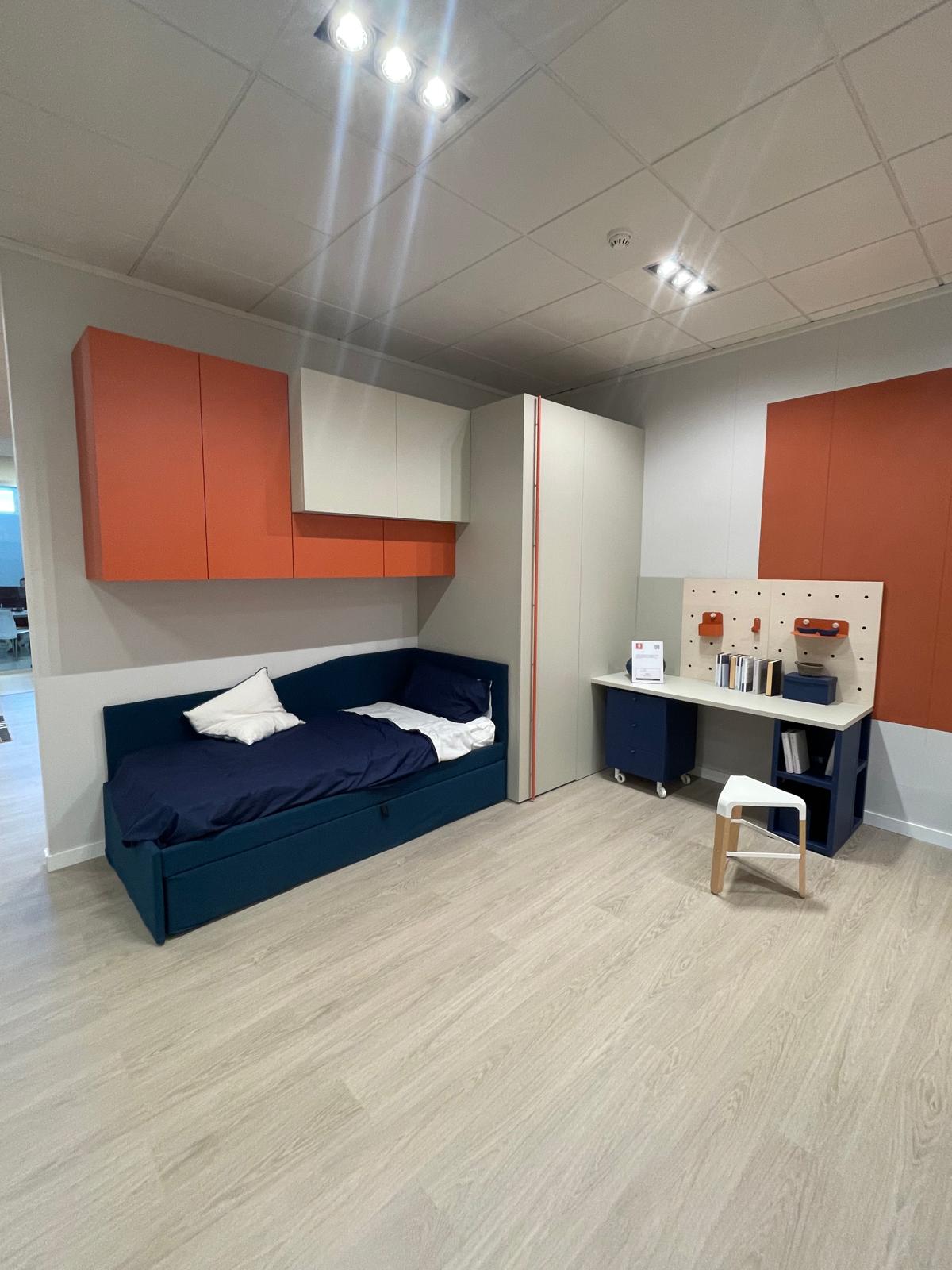 Accanto alla zona notte trova spazio una funzionale area studio da L.212 cm, progettata per offrire un piano di lavoro comodo per compiti, lettura o attività creative. La postazione è completata dallo sgabello Oscar, con rivestimento T131 Fibra Sint. Peck cat. I, che aggiunge praticità e coerenza estetica alla composizione.