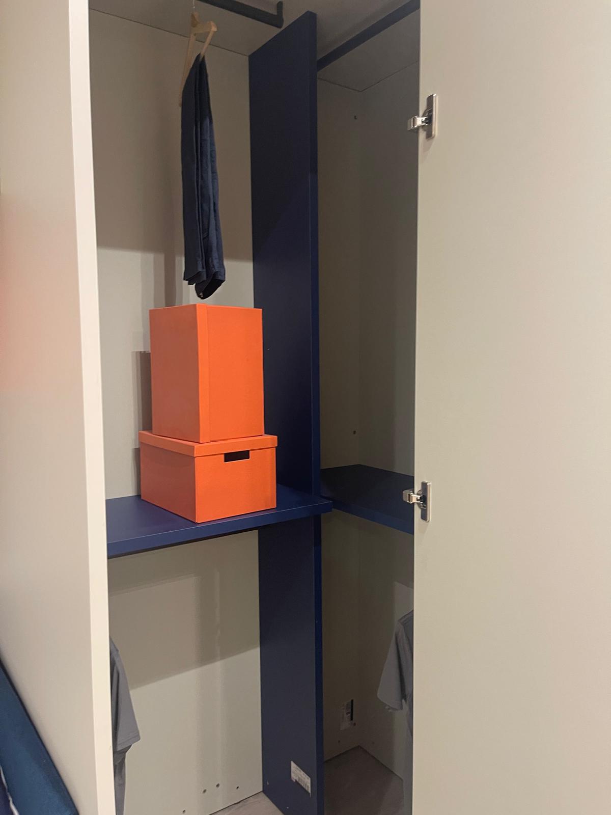 Il progetto si sviluppa attorno a un pratico cabinotto da L.135 cm – P.109,7 cm – H.258 cm, una soluzione intelligente che sfrutta l’altezza della stanza offrendo ampi spazi per organizzare abiti, oggetti e accessori. Sopra la composizione si integra il ponte sospeso UP da L.210 cm, che aumenta ulteriormente la capacità contenitiva mantenendo la parete visivamente leggera e ordinata.