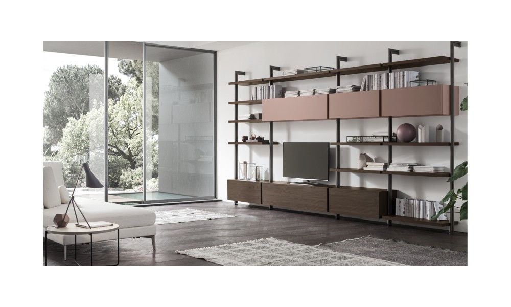 La base e il binario in metallo verniciato disegnano una struttura solida e dal profilo moderno. Linee pulite, geometriche, perfettamente bilanciate: un segno deciso che dialoga con la trasparenza del cristallo, oppure con le texture materiche delle versioni in ceramica, pensate per chi ama superfici resistenti e contemporanee.