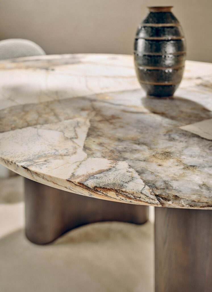 Le finiture pregiate — disponibili con piano in marmo, legno o ceramica — amplificano il suo carattere artistico. Ogni materiale racconta una storia diversa: il marmo, con le sue venature naturali e irripetibili, aggiunge un tocco di eleganza scultorea; il legno, caldo e materico, dona autenticità e comfort visivo; la ceramica, moderna e resistente, valorizza il design con un’estetica contemporanea e raffinata.